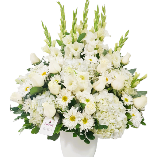 Elegante arreglo de aprox. 80 cm de altura. Tiene Gladiolos, rosas, hortensias, margaritas y alhelíes. Según disponibilidad de stock algunas flores pueden ser reemplazadas.