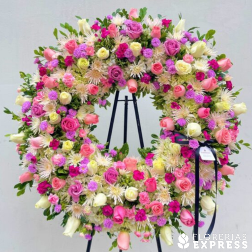 Elegante corona para condolencias en parante de metal. Altura aprox. 1.80 mt.