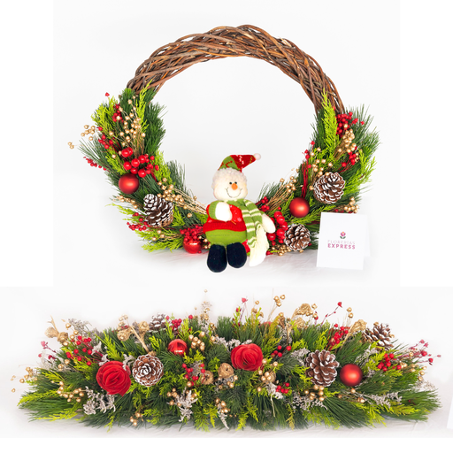 Bello combo compuesto por una Corona de Adviento + un Arreglo en pecera elaborado con pino natural, ambos arreglos tienen aroma a limón y están decorados con flores secas pintadas y detalles artificiales.